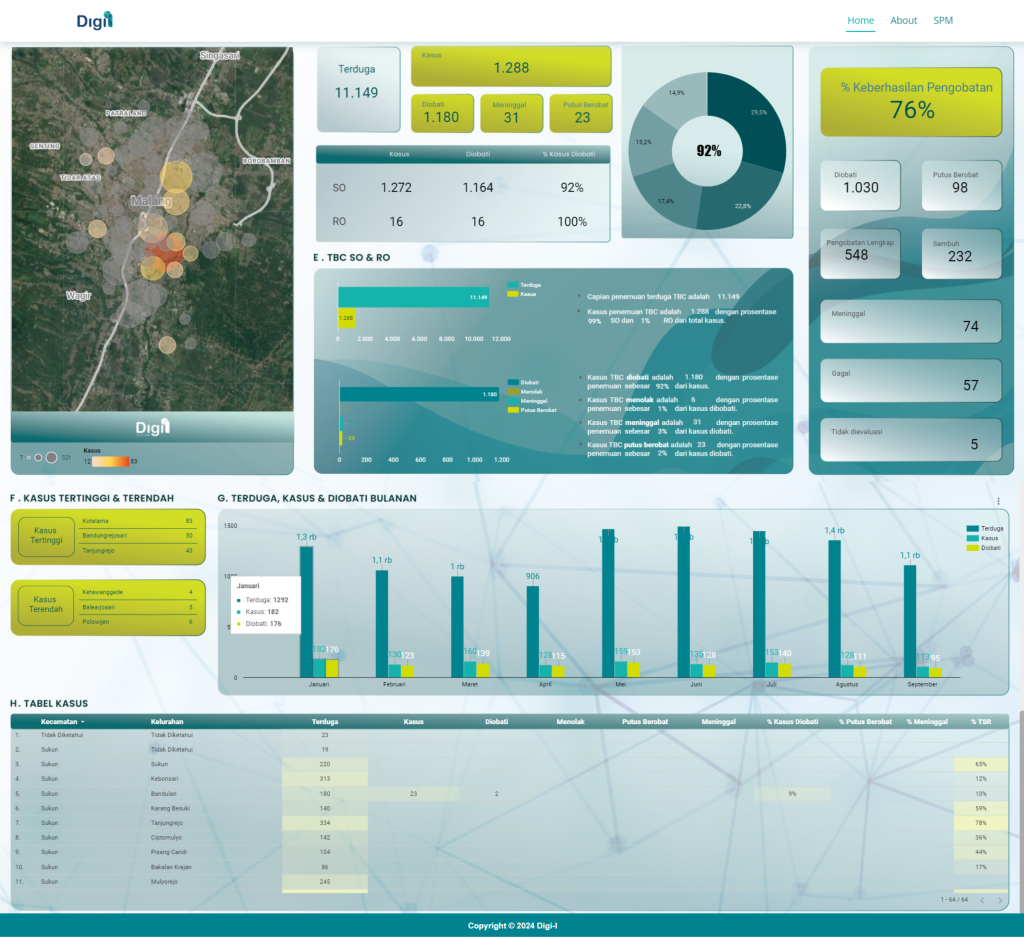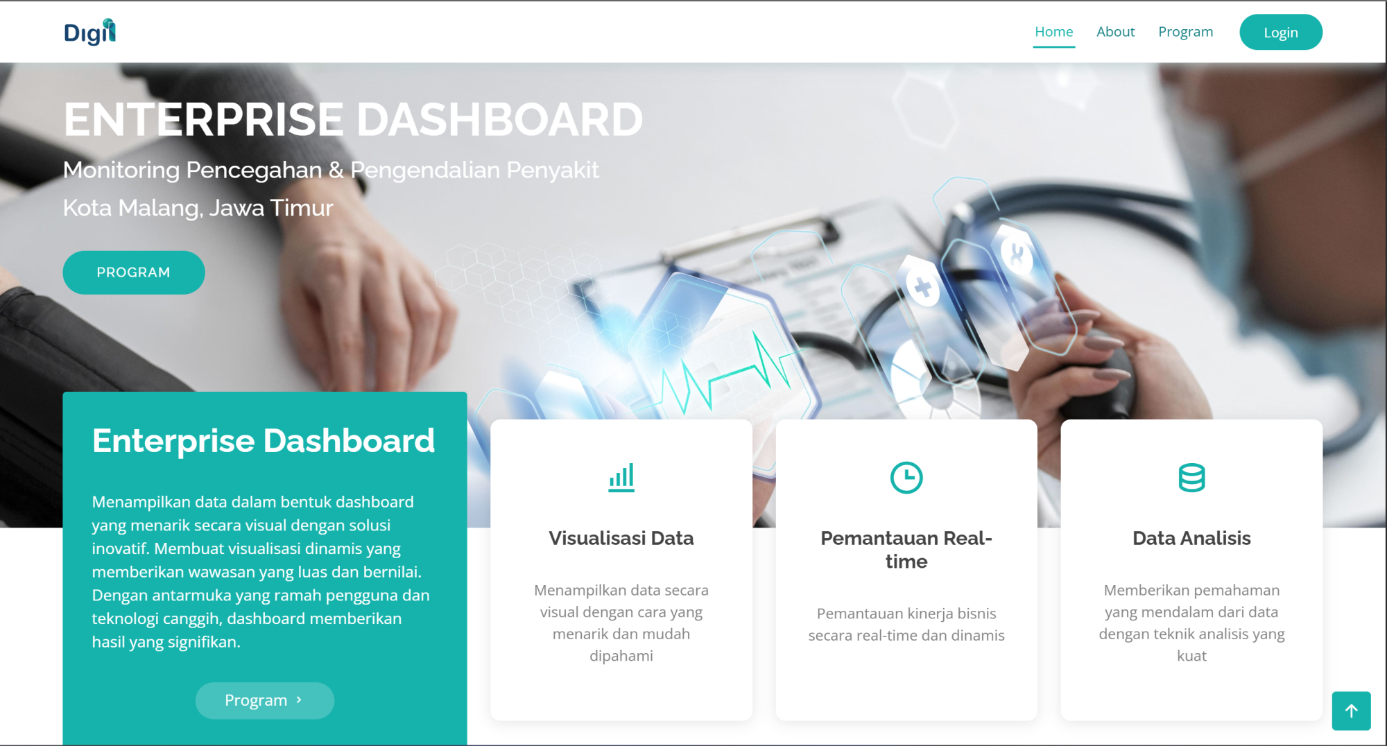 In compliance with regional authorities, Dinas Kesehatan Kota Malang tasked with carrying out government initiatives in the health sector. Disease Prevention and Control is one of Dinas Kesehatan Kota Malang responsibilities. The Disease Prevention and Control Division needs an Analyst Tool that serves as a data-based Decision Support System in order to monitor and assess the spread and control of illnesses in Malang City in a complete and thorough manner. Digi-I PT LPP Agro Nusantara provides the Dinas Kesehatan Kota Malang with an alternate option by creating enterprise dashboard software using primary data that the office owns.